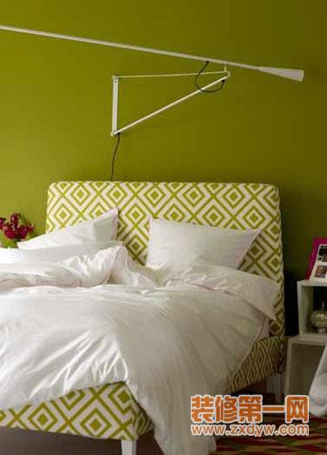 暗绿色和白色的组合床品让寝室尽显夏日清凉感,而床架本身的绿白色块图案增加了一丝活力和动感。绿色的墙面加强了空间的通亮度,和床品以及地毯在色彩上具有明显的反差,让空间大气不沉闷。